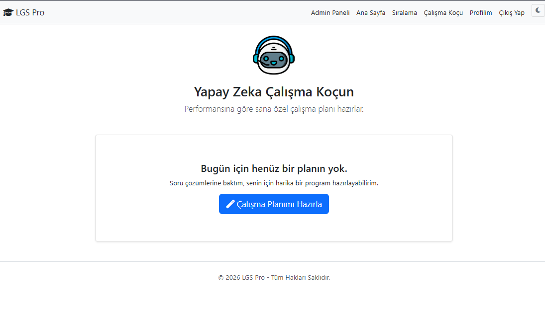 Tamamen yapayzeka destekli öğrencinin güncel durumuna göre çalışma koçu.